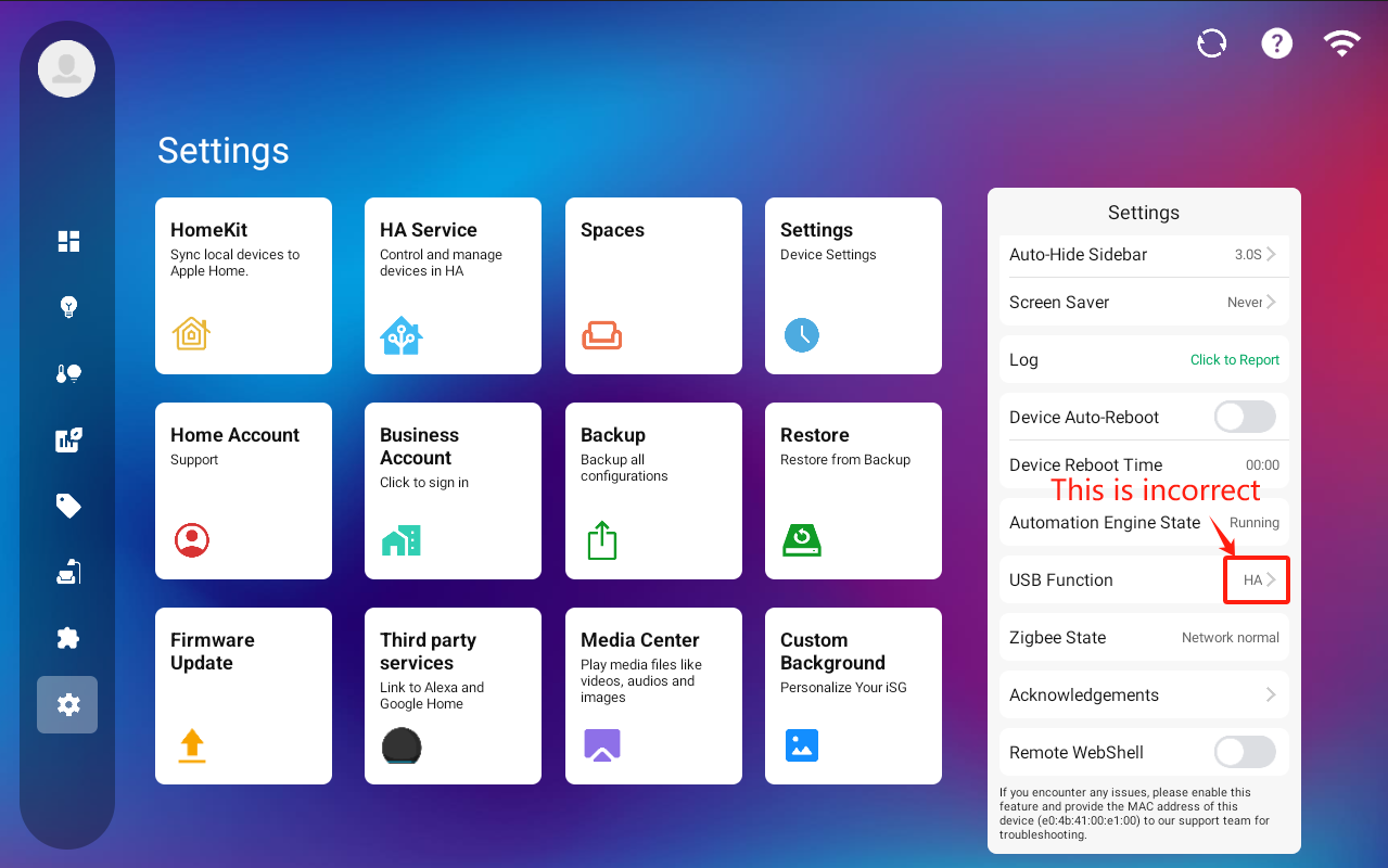 2. Go to **Settings > USB Function**. If the option is set to "HA", click to change it to "Normal USB" and ensure the Zigbee State reads "Network normal".