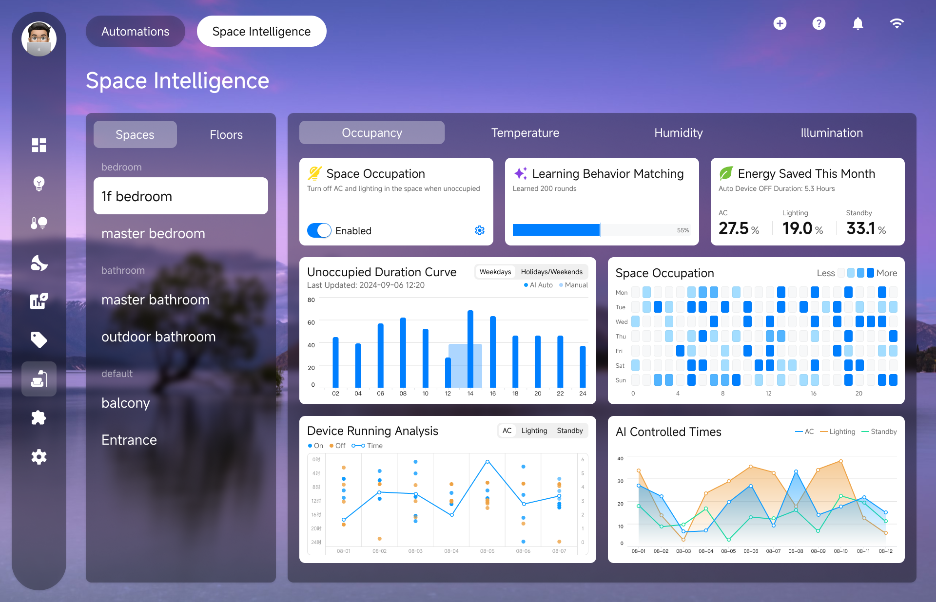 Automatically adjusts the temperature or turns off the AC after the preset duration of no presence. When someone returns, it immediately restores the comfortable temperature.