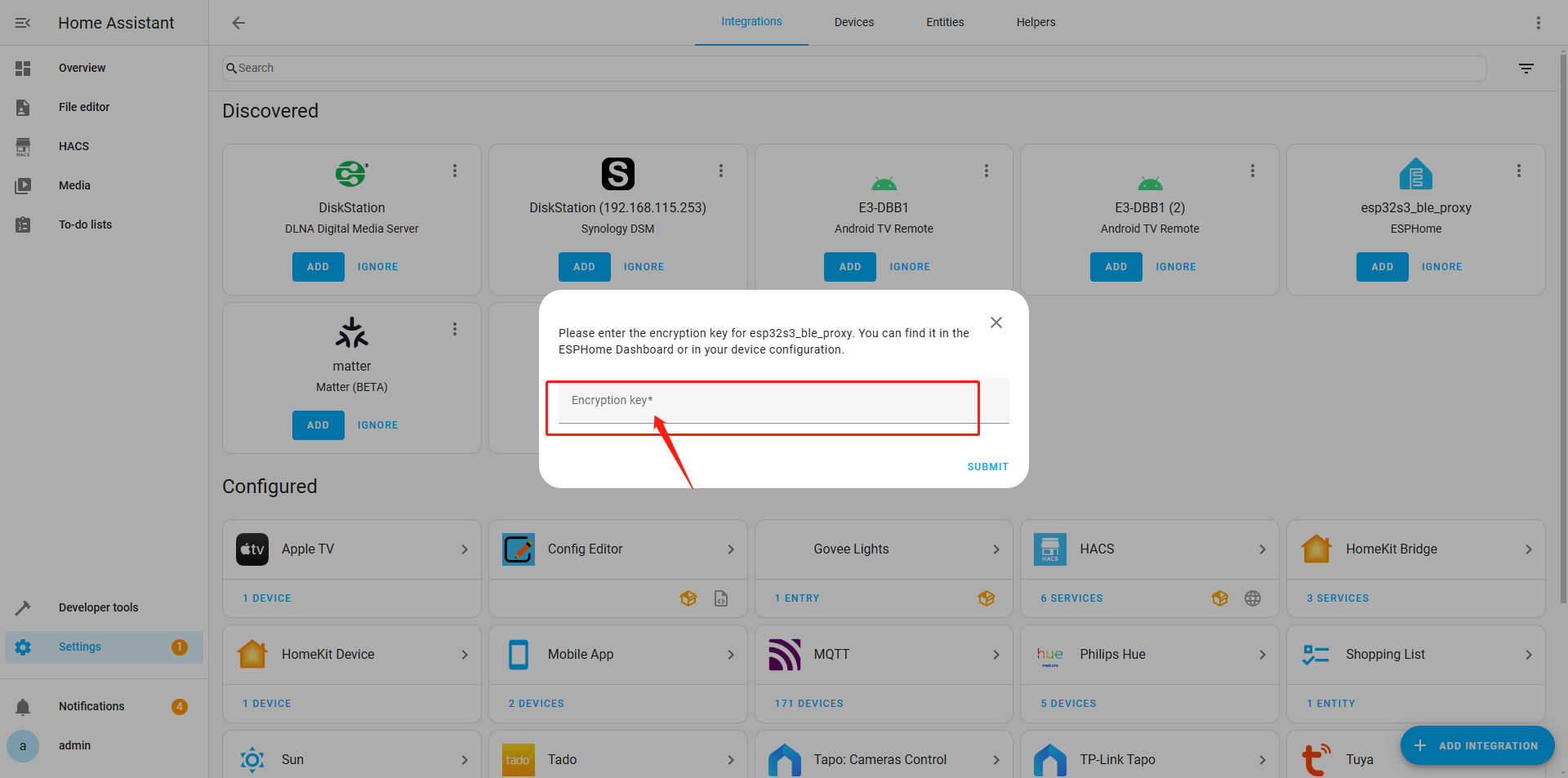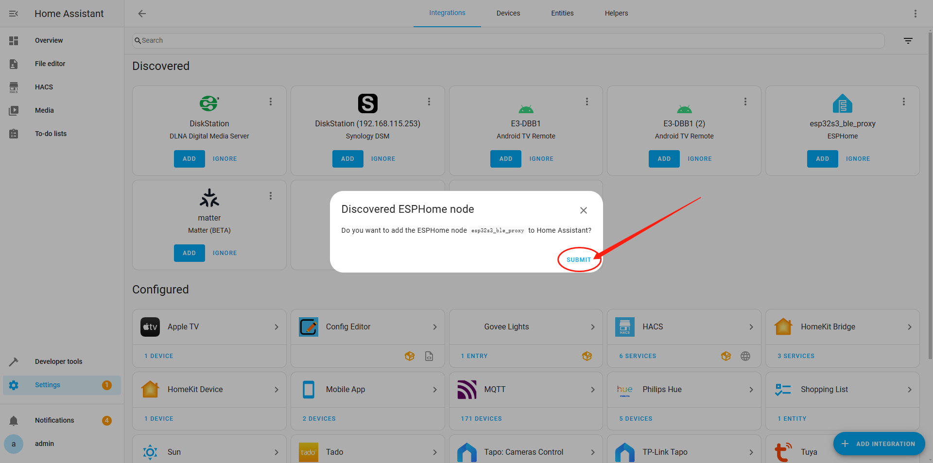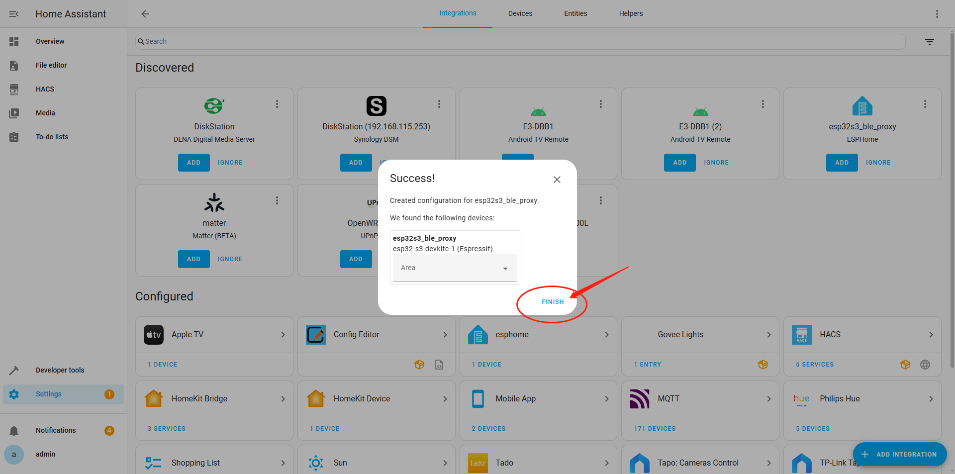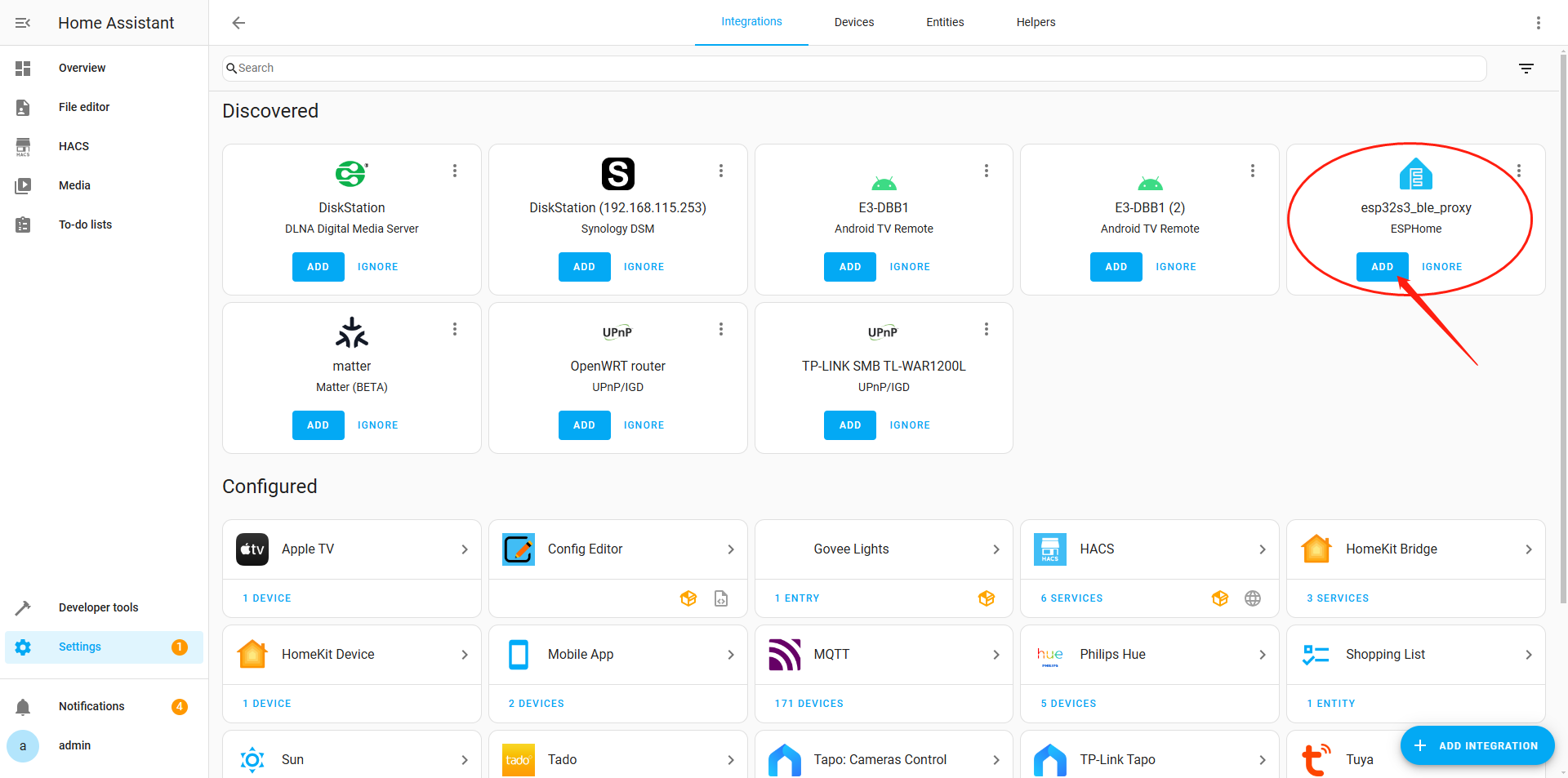 Under the "Discovered " category, you will find a device named "esp32s3_ble_proxy ESPHome" that has been detected. Click the "Add" button to complete the device addition process.