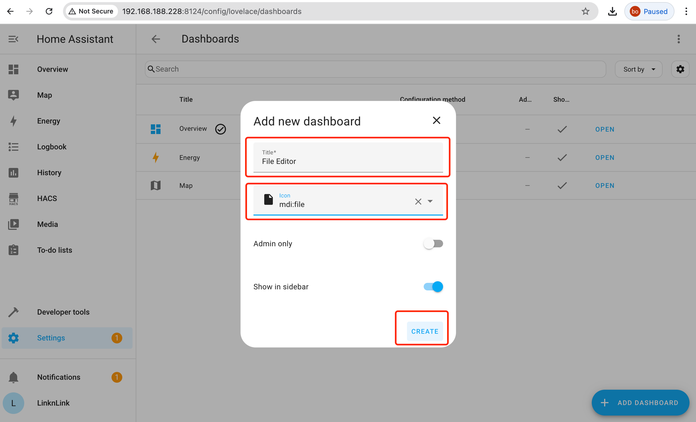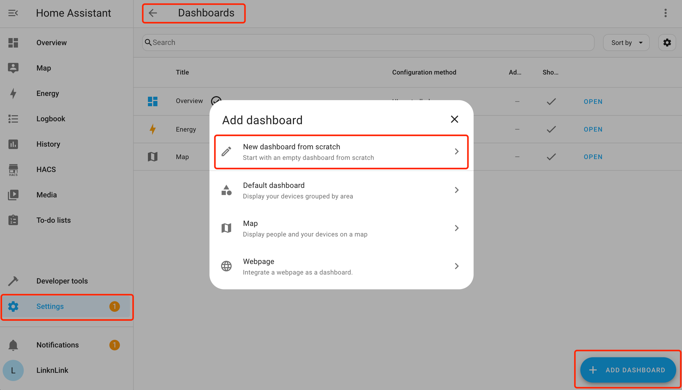 6) Restart Home Assistant, Go to Settings - Dashboards