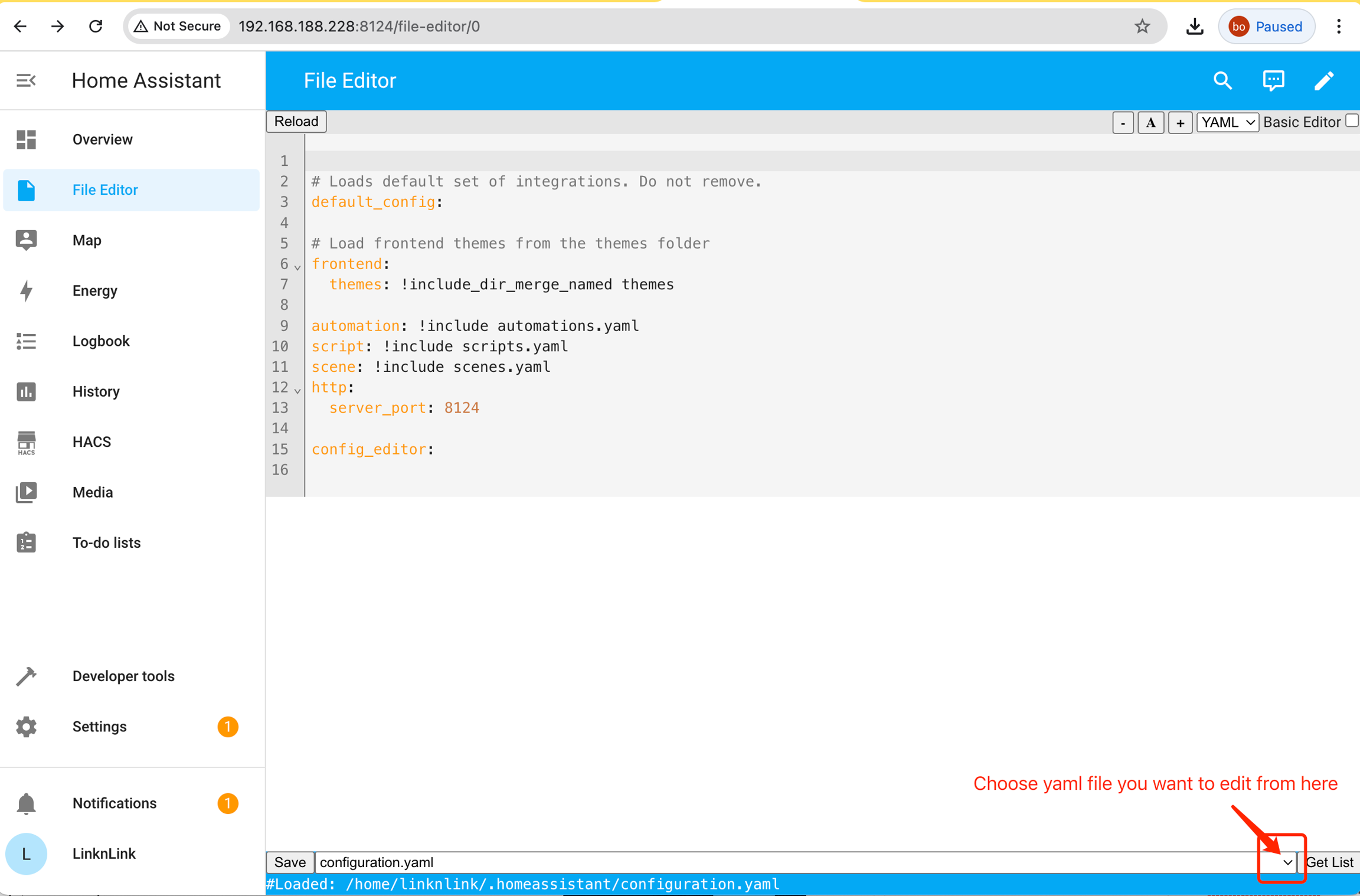 15) Now you can use File Editor to edit configration.yaml file, choose file from bottom right
