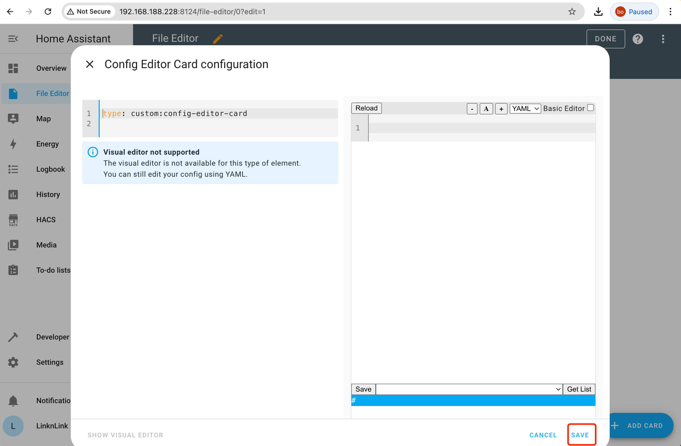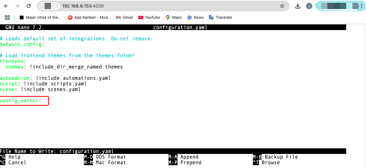 5) Input "config_editor:" , and save the configuration.yaml