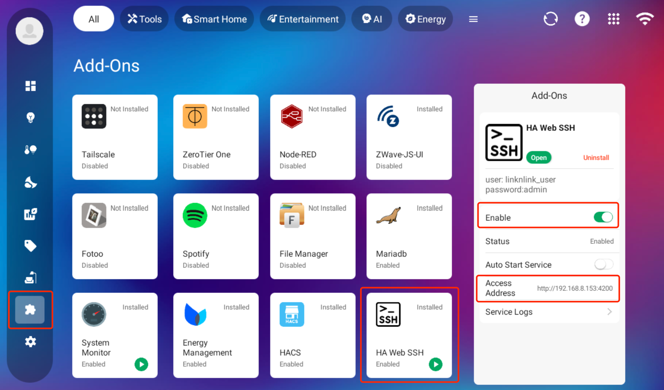 3) Go to iSG add-ons, click HA Web SSH, install and Enable it.