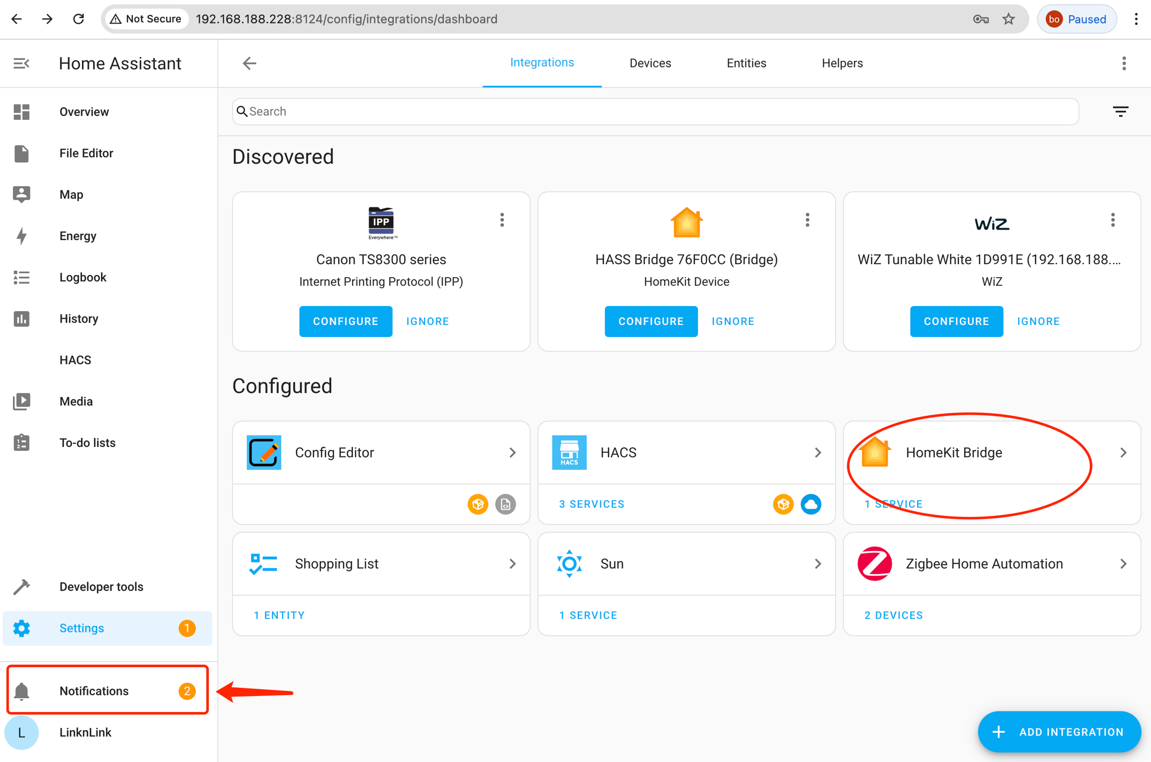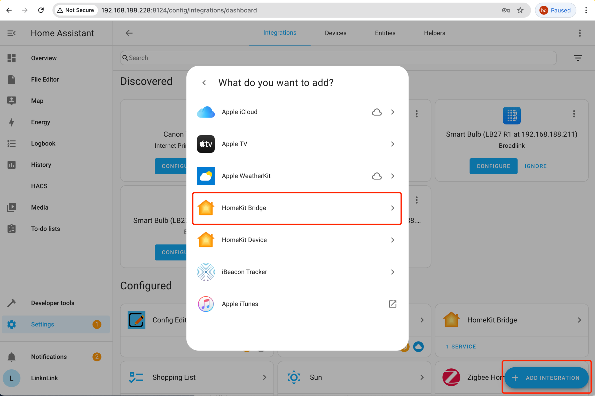 2) Go to Settings - Devices & Services - "+ ADD INTGRATION" - HomeKit Bridge