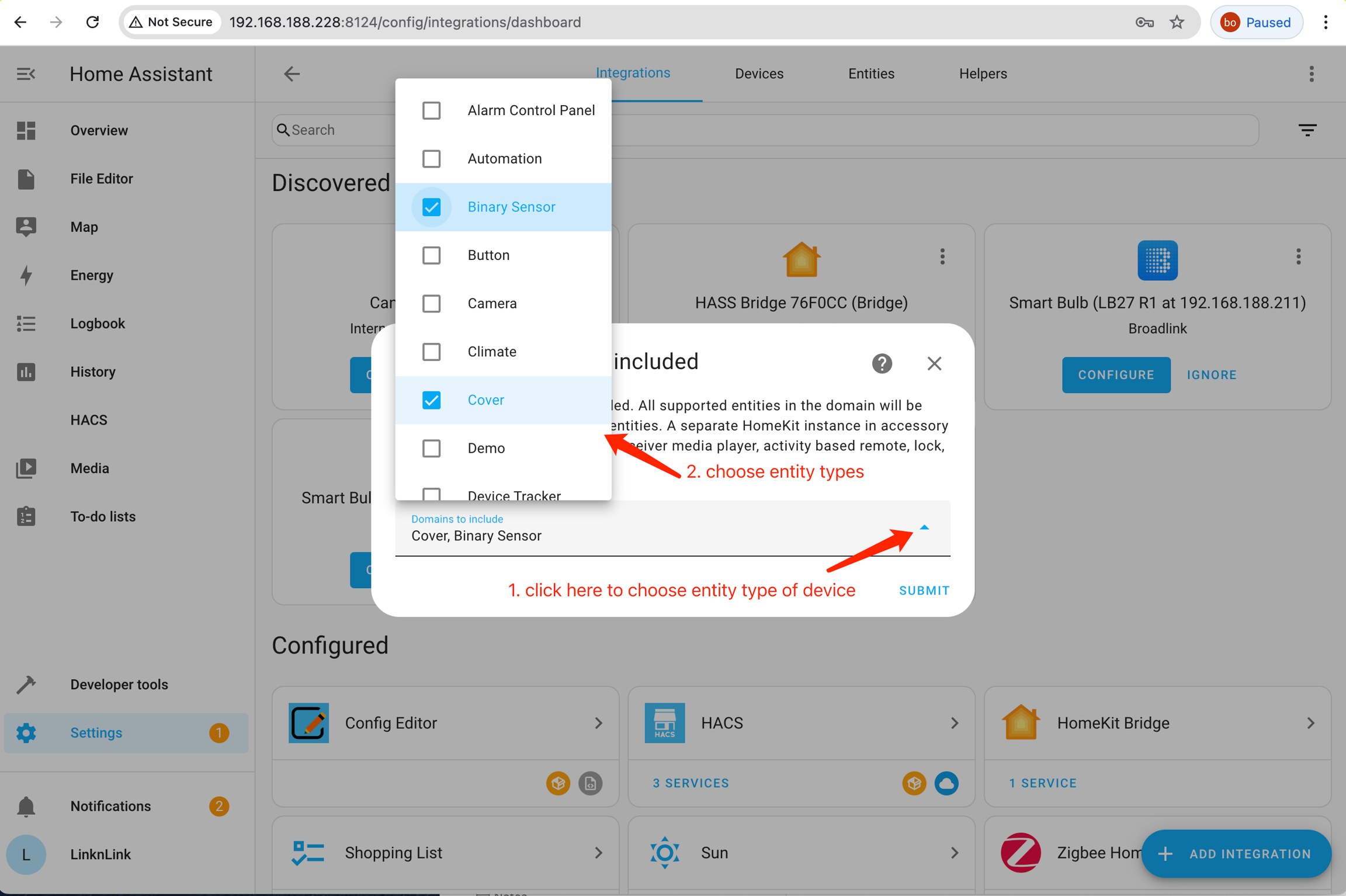 *Please note:you can choose to select all entity types, which will add all these devices to the Apple Home app. Alternatively, you can select specific entity types that you wish to add to the Apple Home app. Keep in mind that only entities successfully added to Home Assistant will appear later in the Apple Home app.