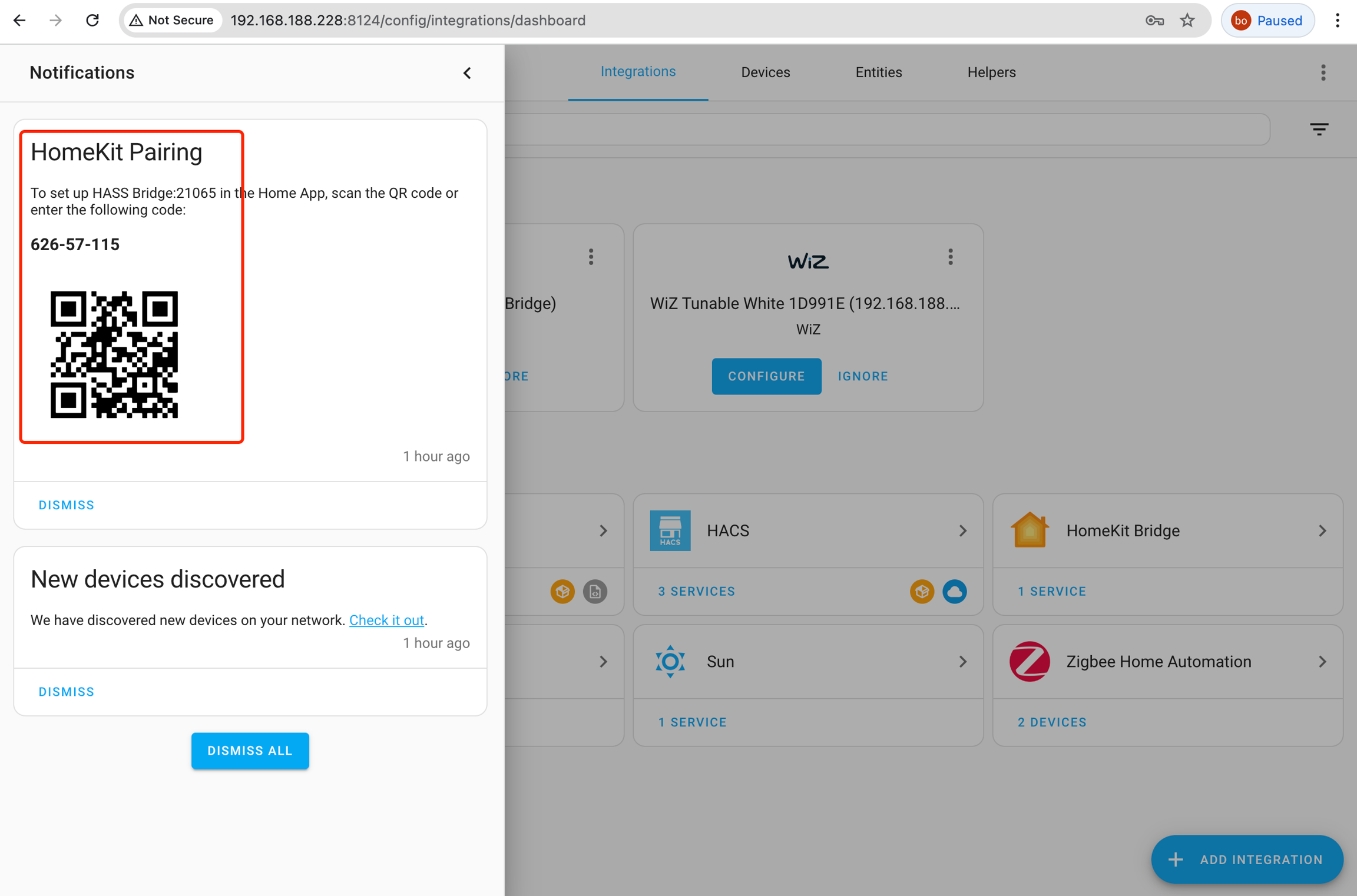 4) After successfully adding the HomeKit Bridge, it will appear in the integration list. Click on the left sidebar, and you will find the HomeKit Bridge QR code.
