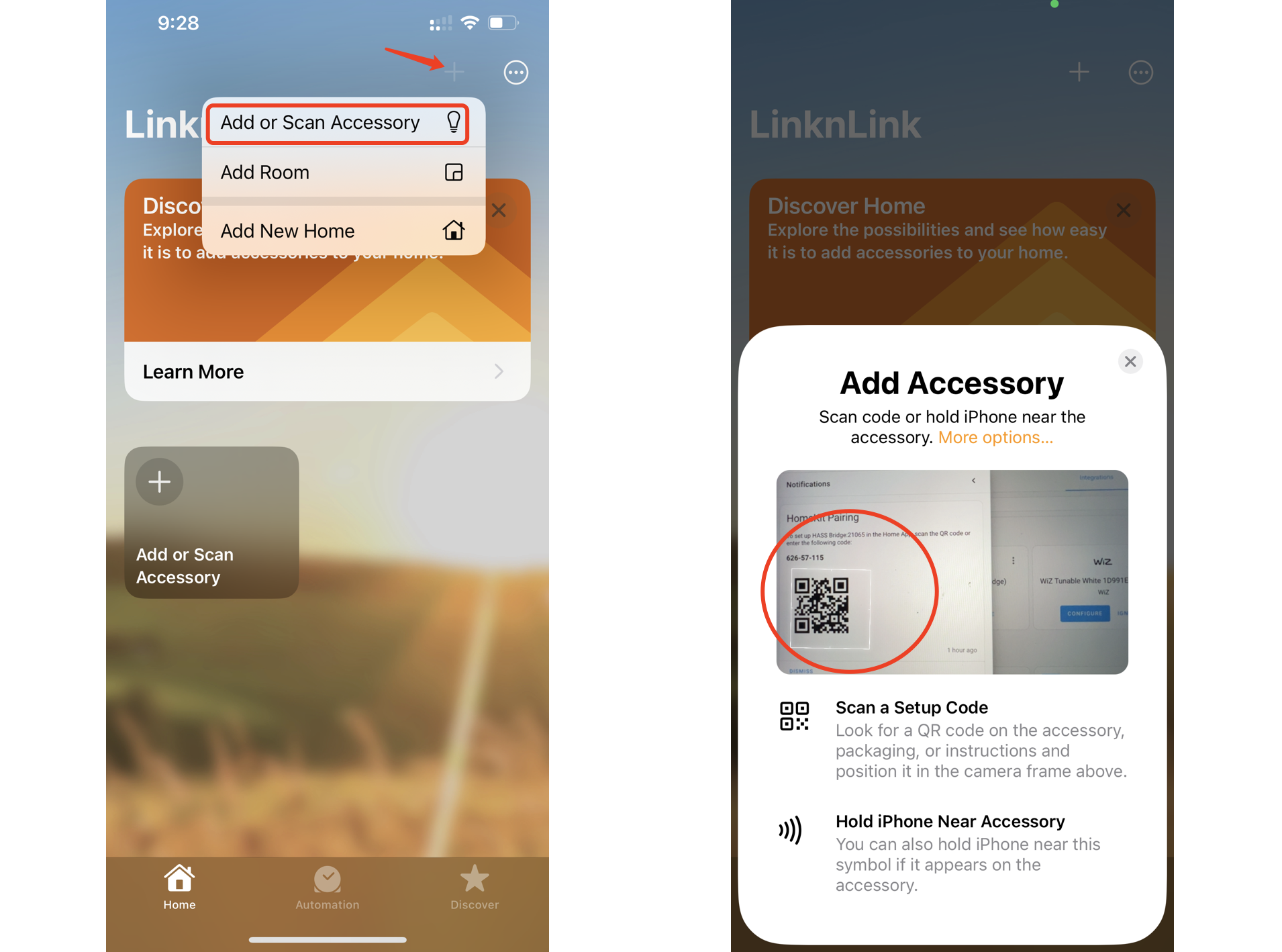 5) Using an iPhone / iPad, open the Apple Home app. After setting up your home, tap the "+" in the top right corner and select "Add or Scan Accessory." Point the camera at the QR code displayed in Home Assistant and scan to add the device.