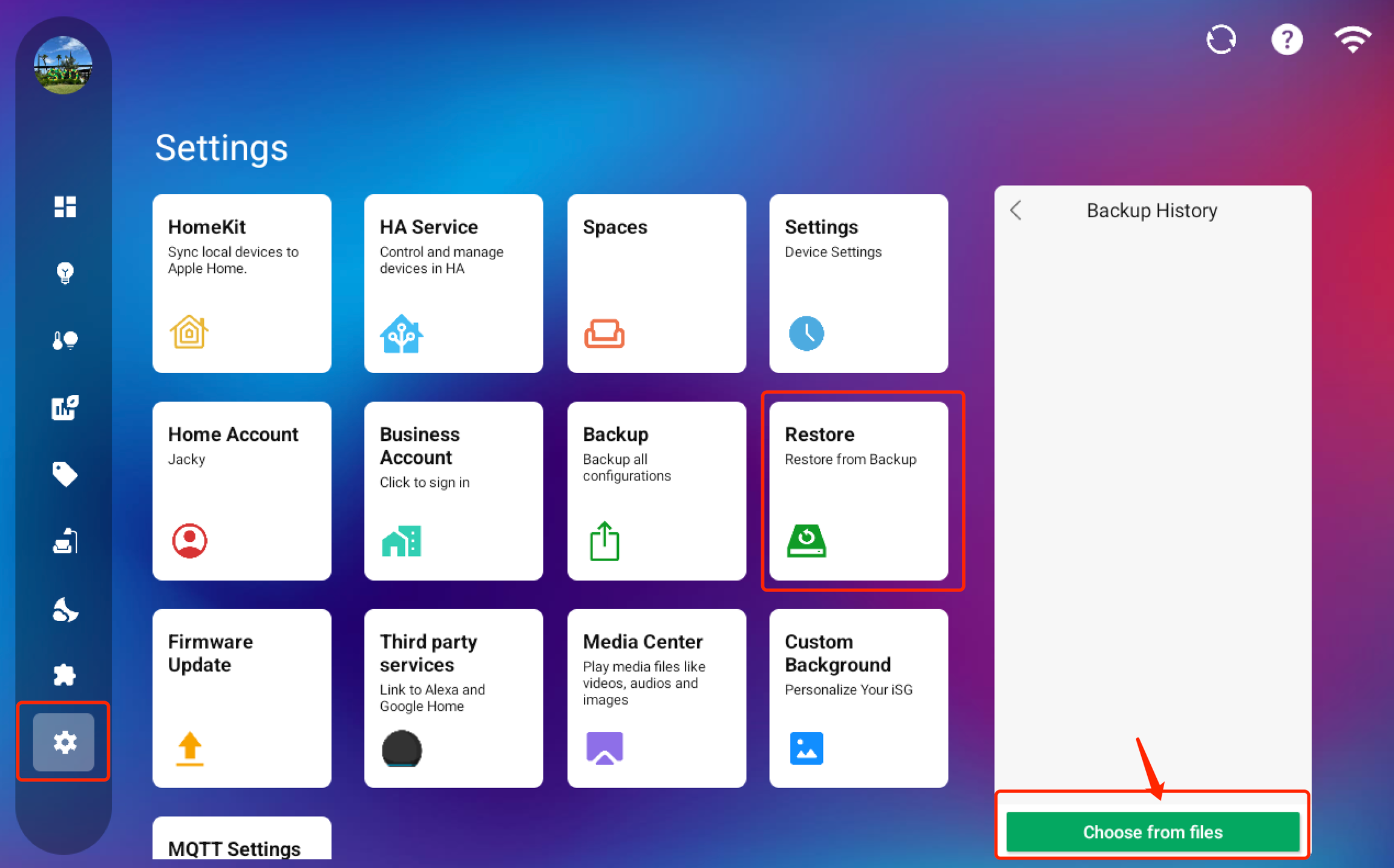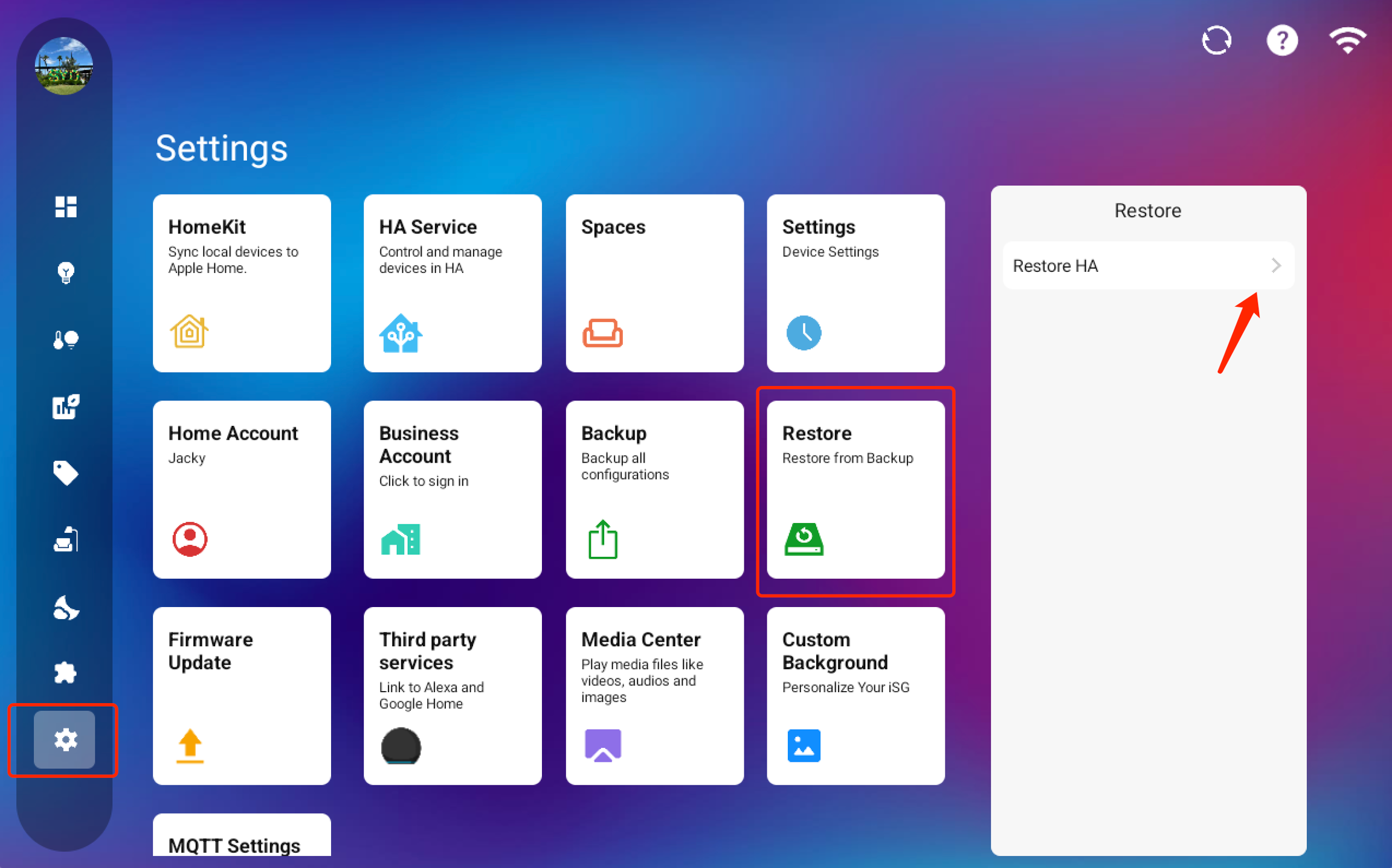 Because the version of Home Assistant that runs natively on iSG is Core, the restoration process in Home Assistant must be carried out via the iSG settings.