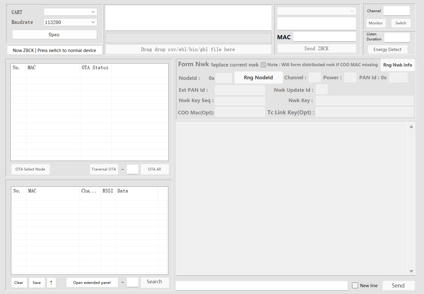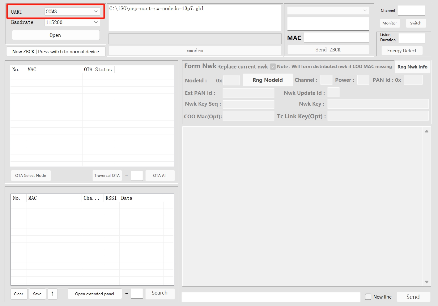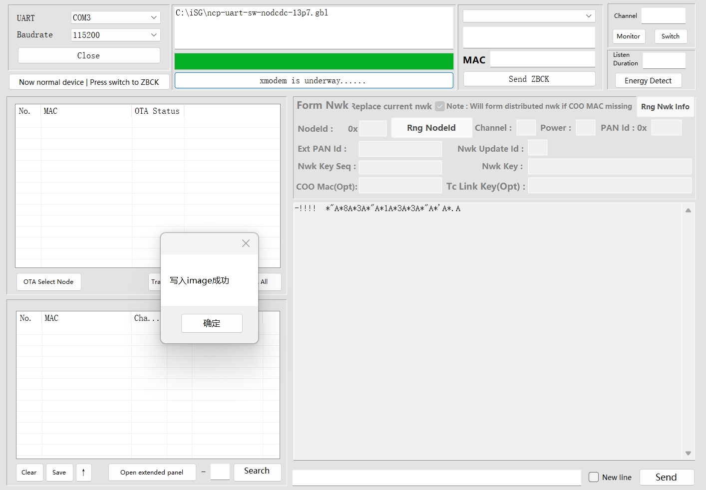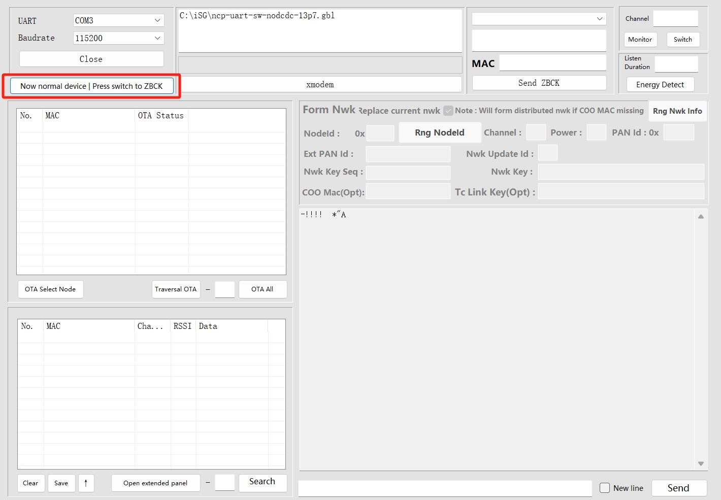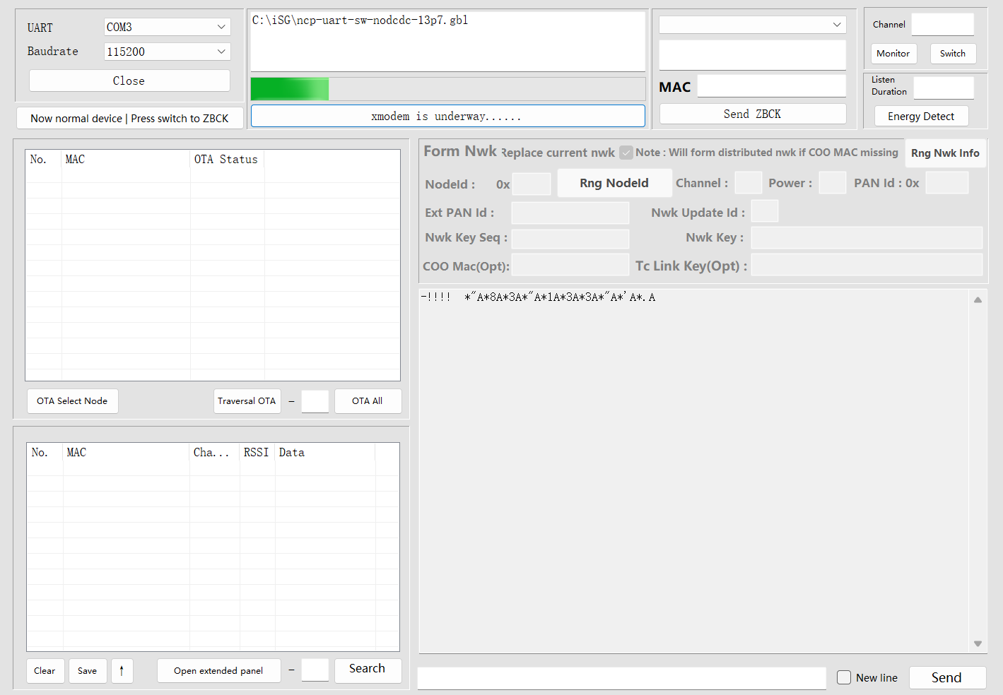 Start Upgrade: Click the button and shows "Now normal device | Press switch to ZBCK" , select Xmodem to start the upgrade, and monitor the progress bar until completion.