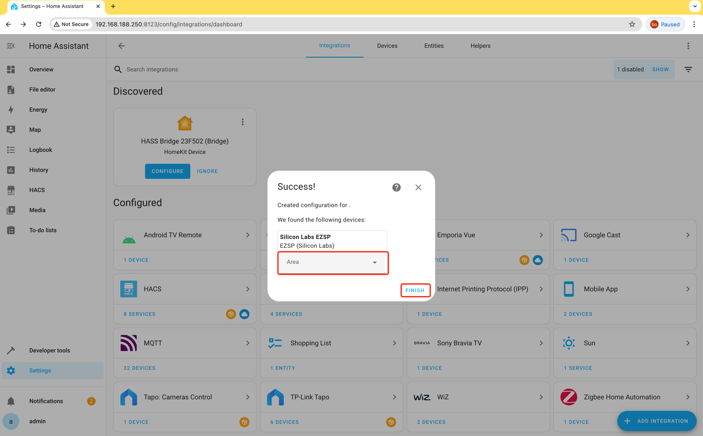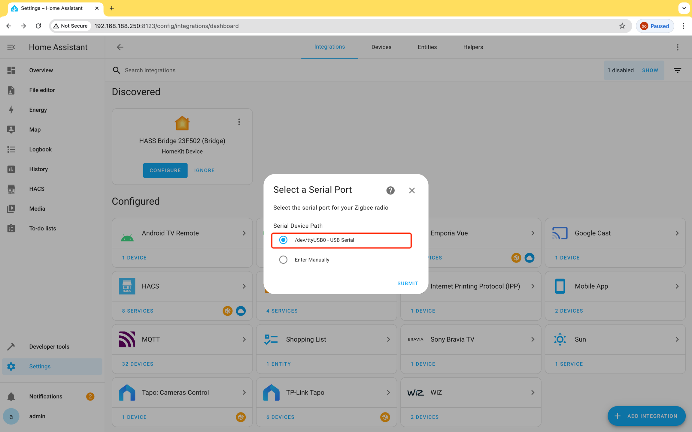 Configure Integration: After completing the ZHA integration, select the device path (e.g., /dev/ttyUSB0). If not recognized, try re-inserting the Dongle and adding ZHA again.