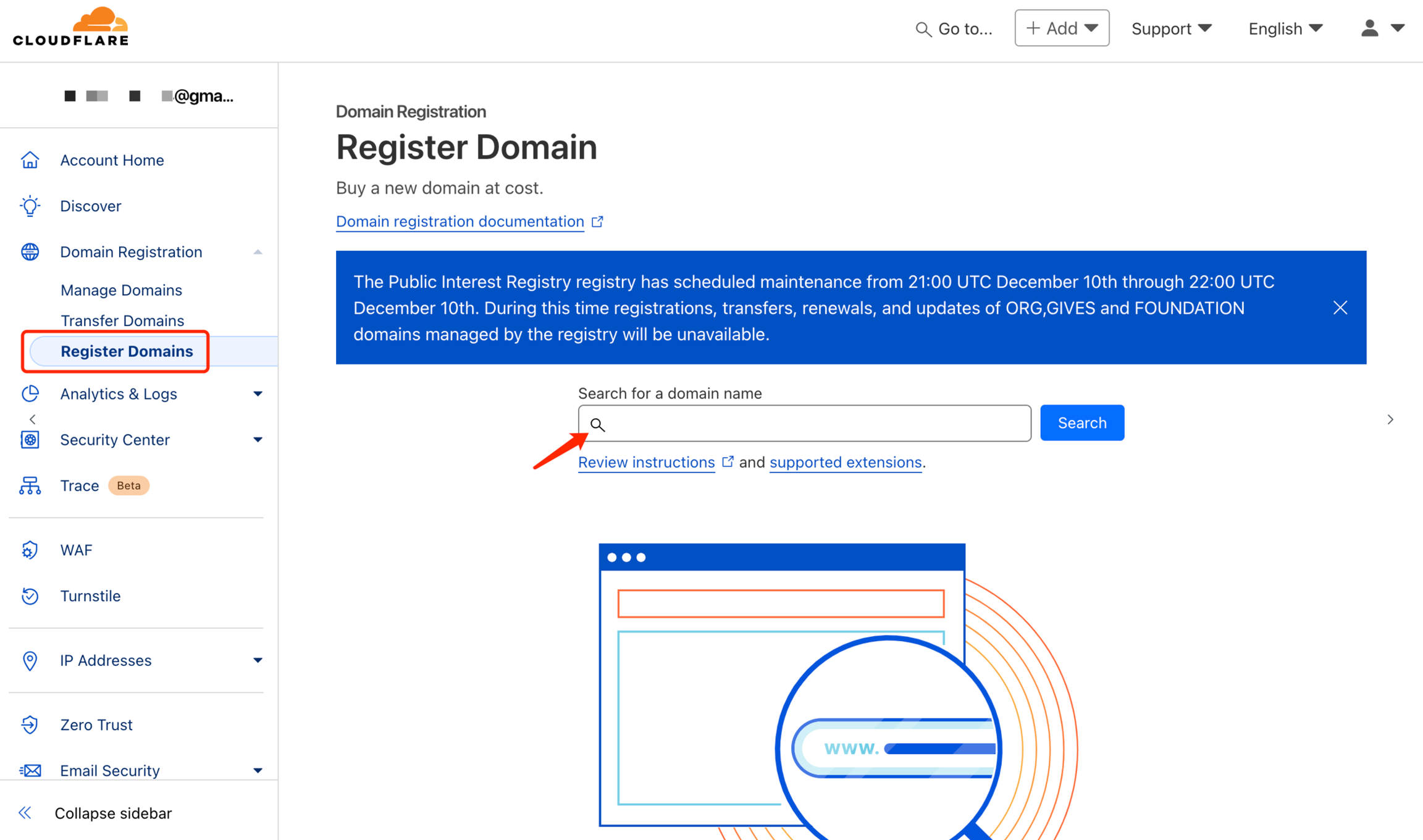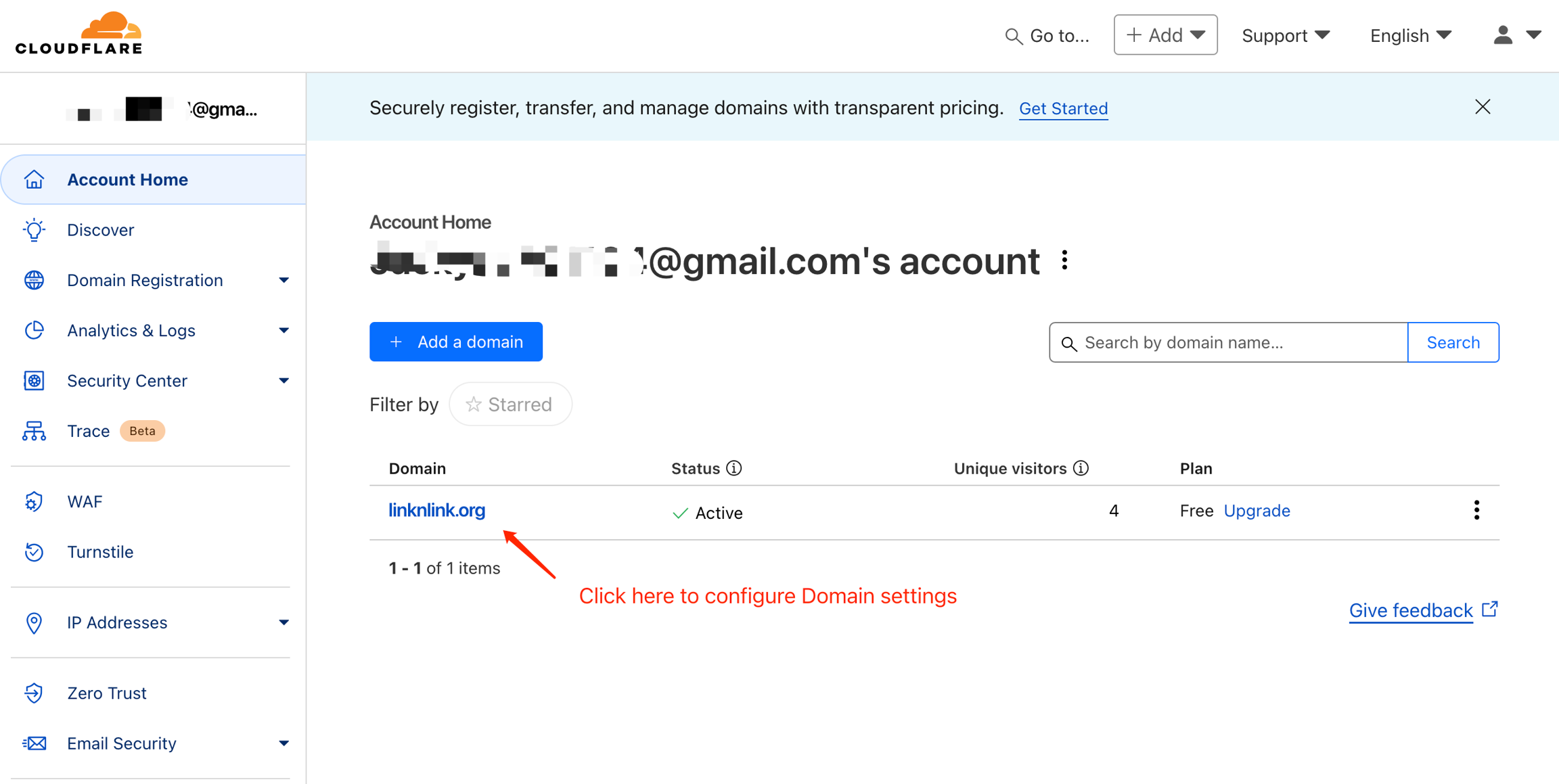 Add a domain name. If you already have a domain name, click "Add a domain". If you don't have a domain name, you can also purchase a domain name in CloudFlare. The domain name purchased in CloudFlare will be automatically added to the Domain list.