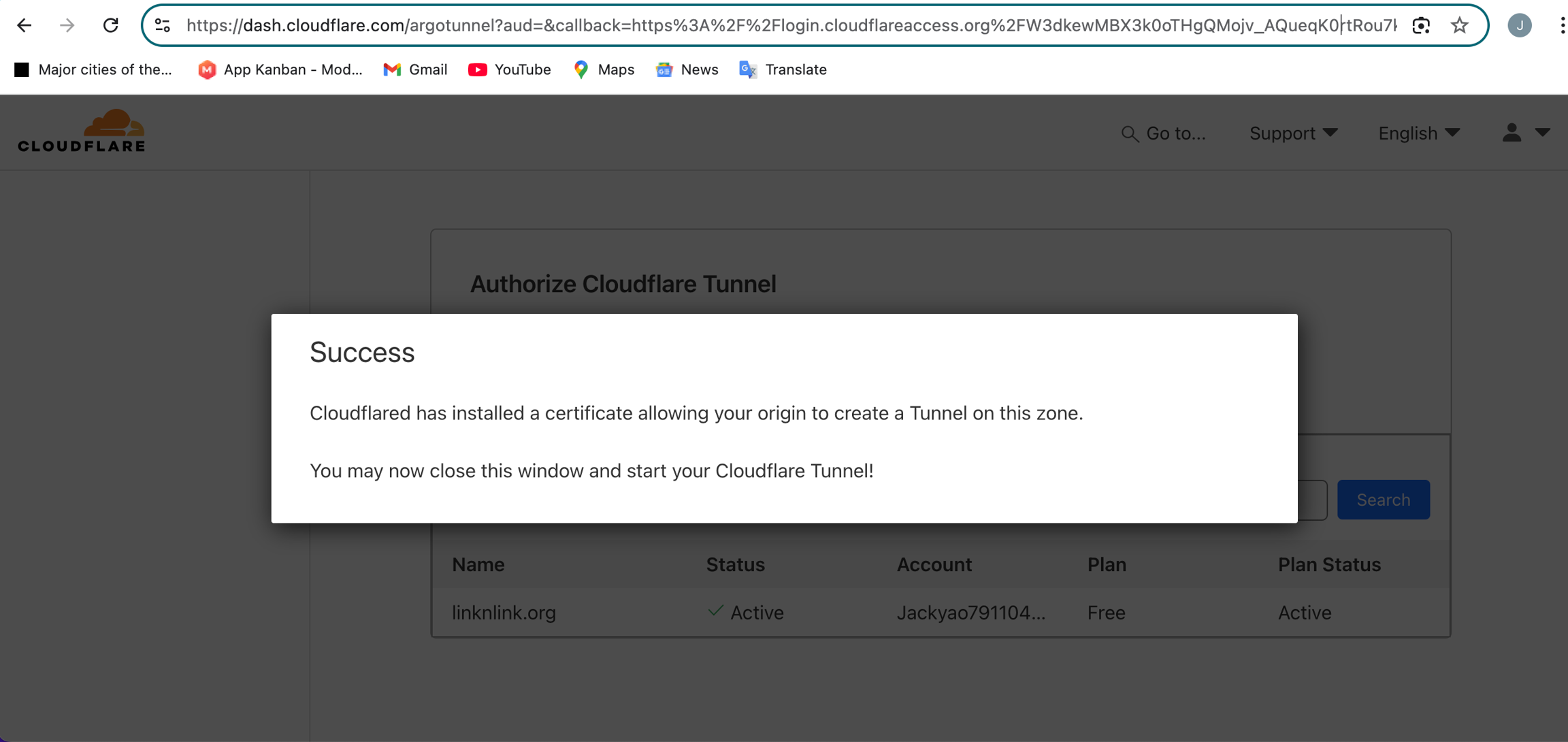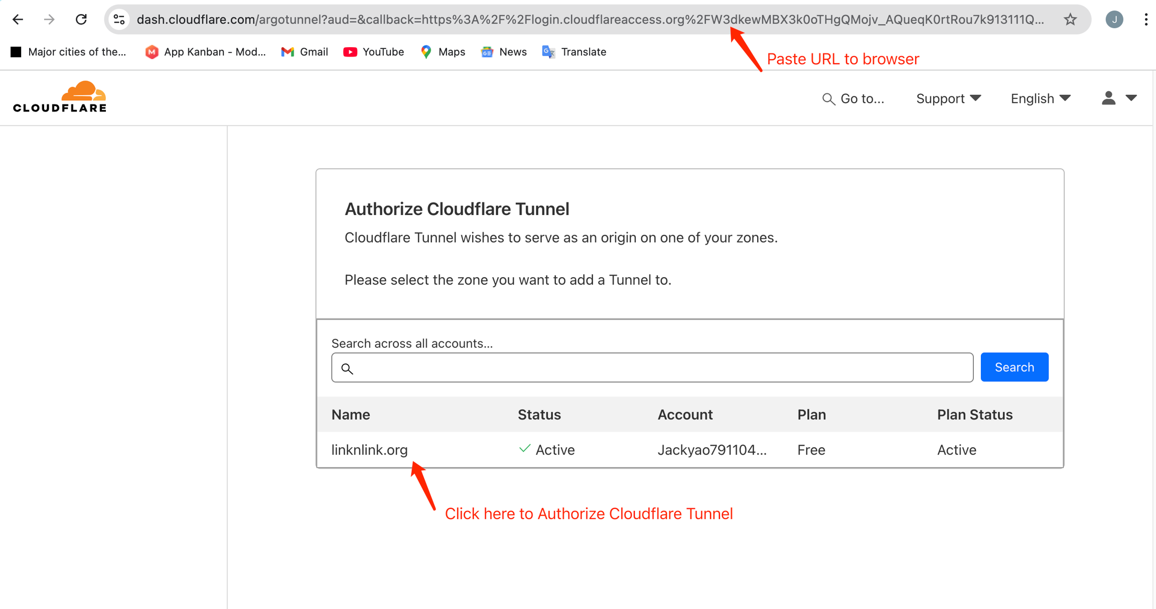 Click "Authorize CloudFlare Tunnel", a page will pop up, click your domain name and activate it.