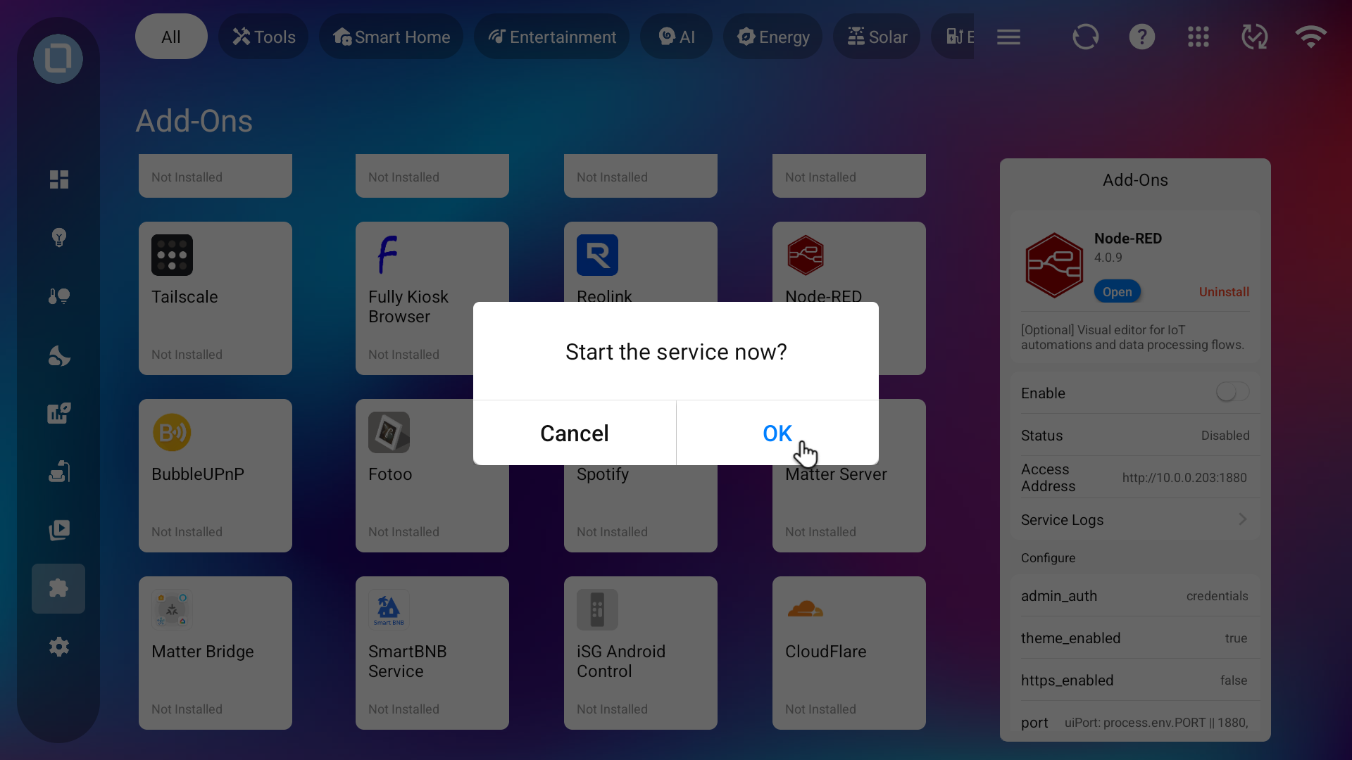 <figure><img src="https://1561436000-files.gitbook.io/~/files/v0/b/gitbook-x-prod.appspot.com/o/spaces%2FpCtFemS511EXKjNnjKqg%2Fuploads%2FaOz2eLOZDrjZAuj6sEL7%2F8-Addon-NodeRED-Enable.png?alt=media&#x26;token=4c35b1db-42b5-45e6-a31d-a413ed178cc5" alt=""><figcaption></figcaption></figure>